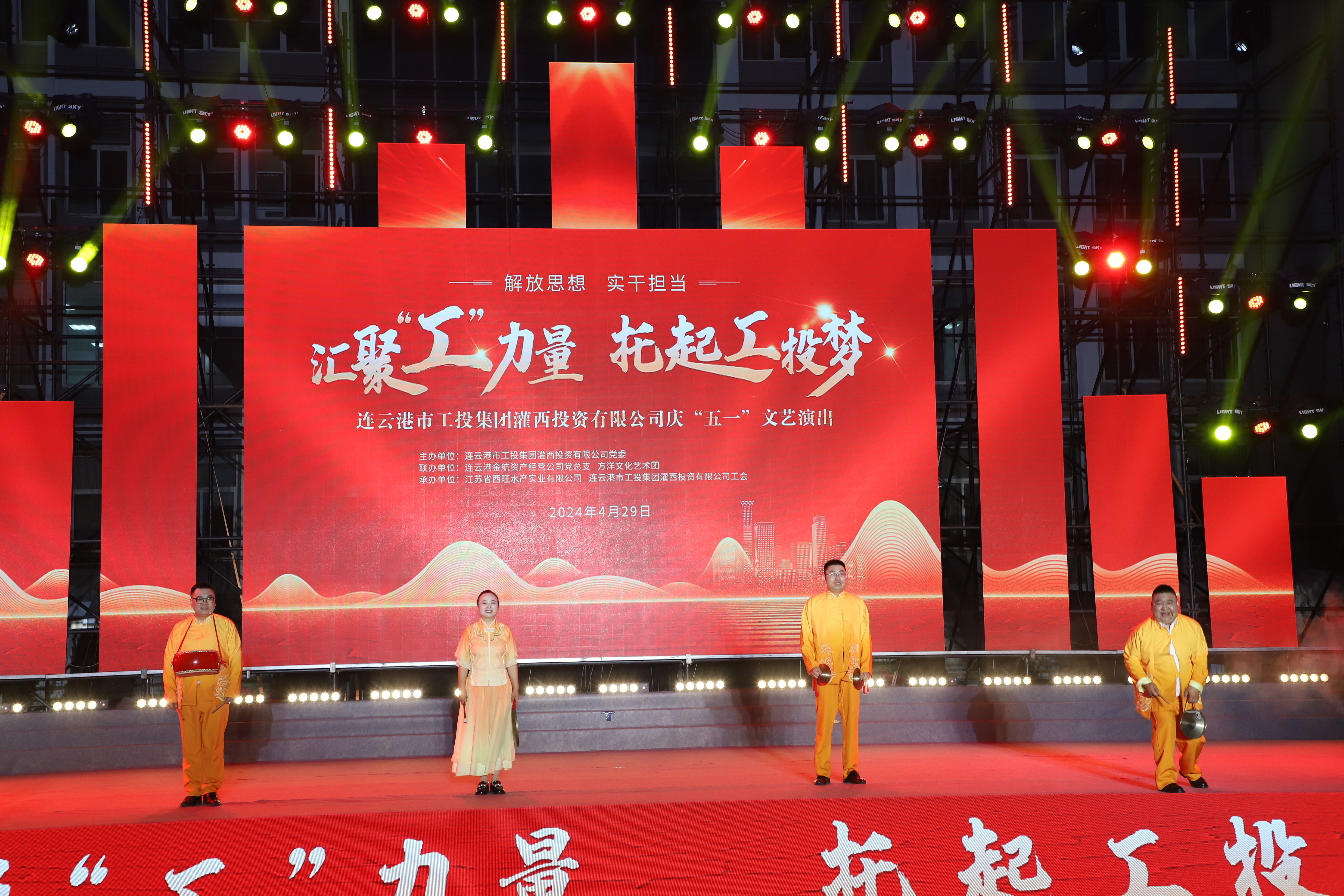 4月29日晚,灌西投資公司《匯聚“工”力量,托起工投夢》慶“五一”文藝演出在機(jī)關(guān)大樓前廣場舉行。本次活動由灌西投資公司黨委主辦,連云港金航資產(chǎn)經(jīng)營公司黨總支、方洋文化藝術(shù)團(tuán)聯(lián)辦,旨在通過藝術(shù)的形式,營造崇尚勞模、學(xué)習(xí)先進(jìn)、尊重勞動的良好氛圍,豐富公司員工的文化生活,激發(fā)干事創(chuàng)業(yè)熱情。集團(tuán)公司領(lǐng)導(dǎo)張六林、戴鴻鳴、汪群及部分部門負(fù)責(zé)人,灌西、金航資產(chǎn)經(jīng)營公司領(lǐng)導(dǎo)班子成員出席演出活動,縣臨港產(chǎn)業(yè)區(qū)管委會、華能灌云清潔能源發(fā)電責(zé)任有限公司、徐圩新區(qū)方洋集團(tuán)等有關(guān)領(lǐng)導(dǎo)受邀觀看演出。