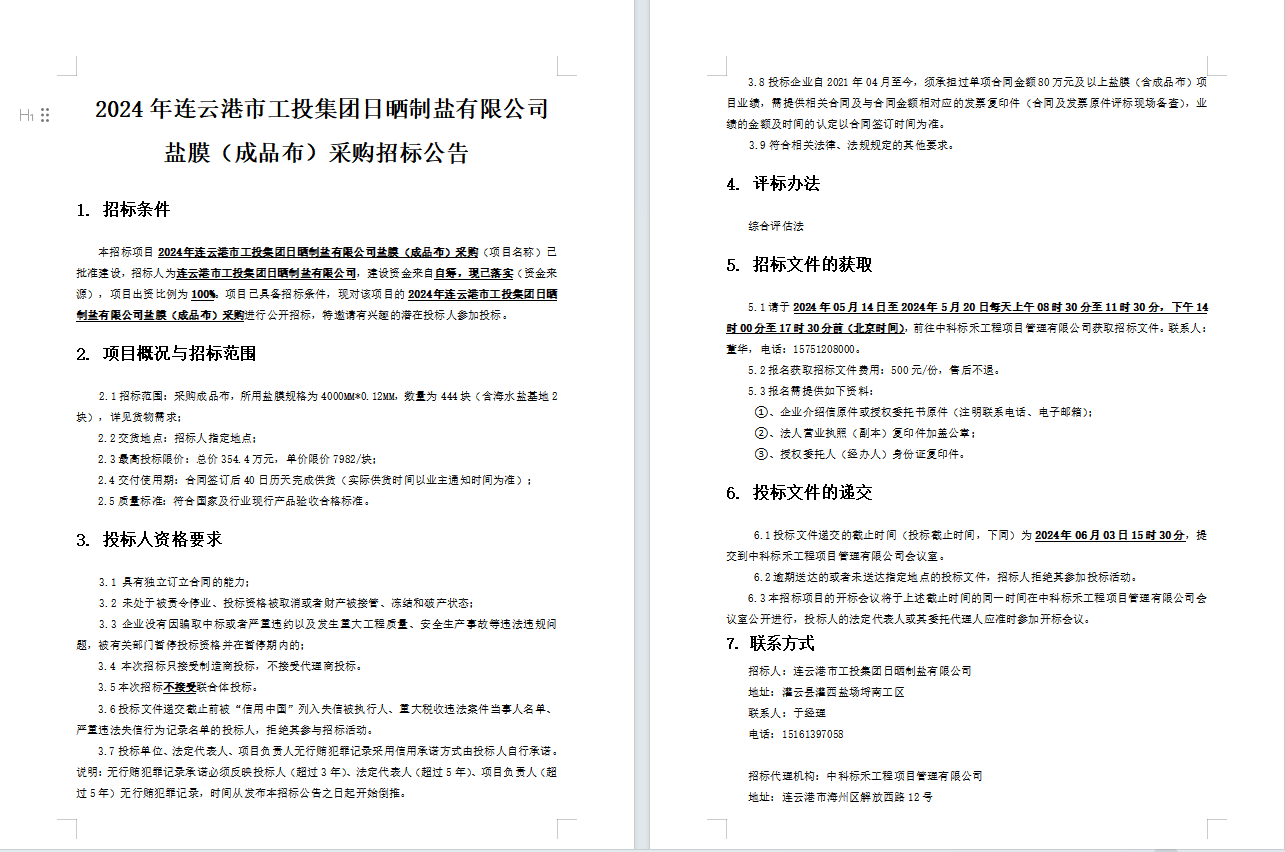 2024年連云港市工投集團(tuán)日曬制鹽有限公司鹽膜(成品布)采購招標(biāo)公告
