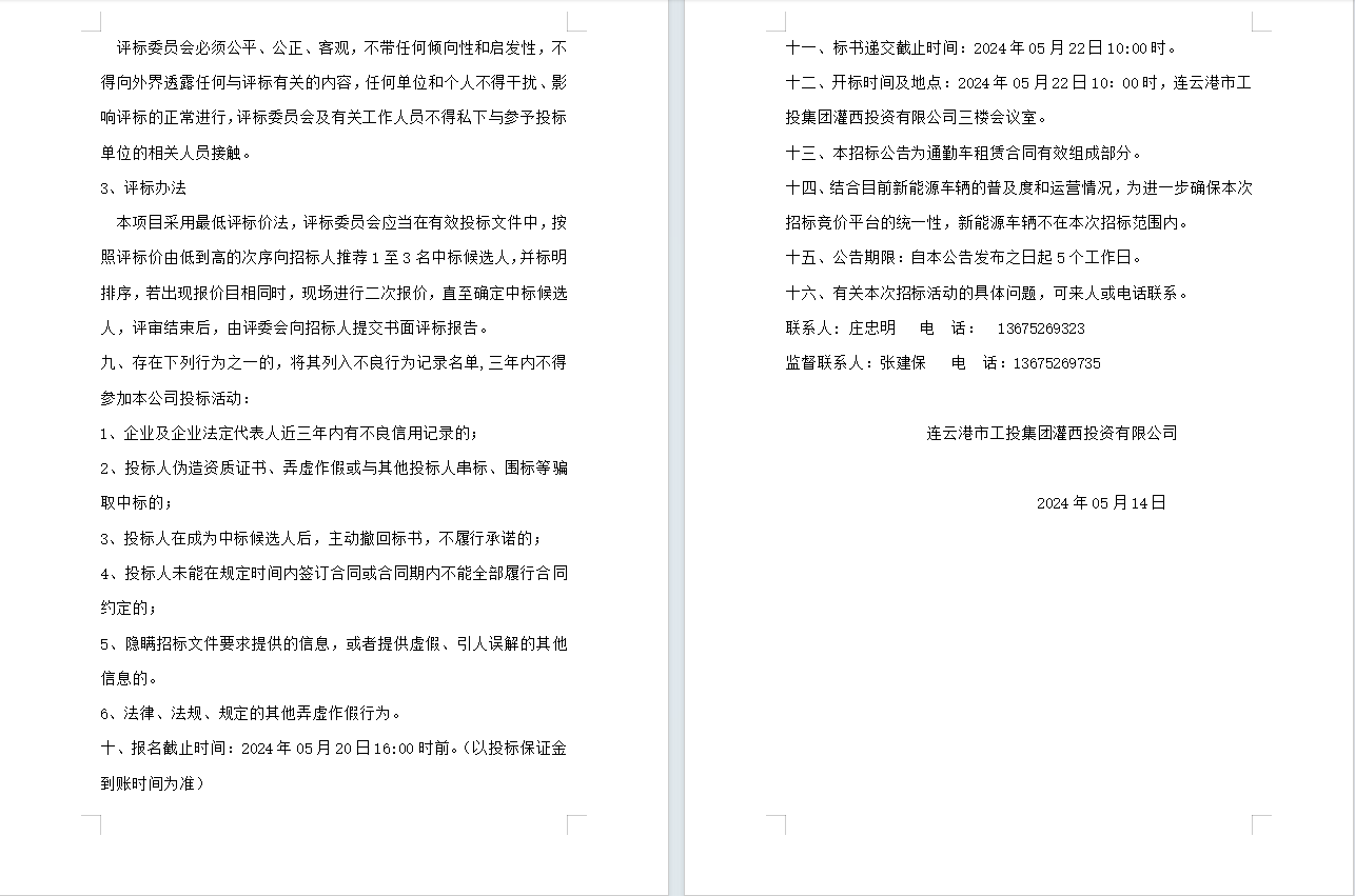 連云港市工投集團灌西投資有限公司員工上下班通勤車輛租賃項目公告