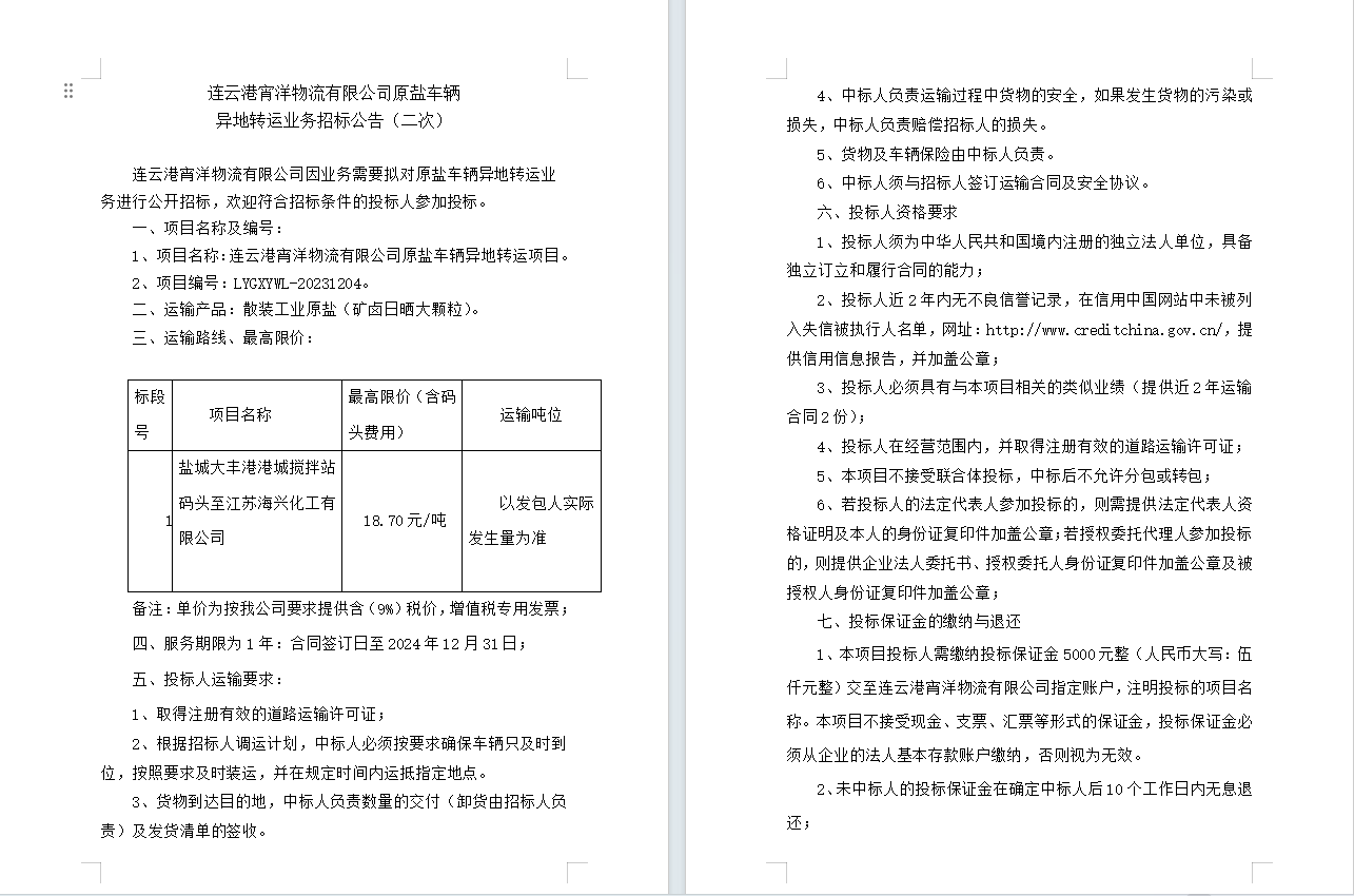 連云港宵洋物流有限公司原鹽車(chē)輛 異地轉(zhuǎn)運(yùn)業(yè)務(wù)招標(biāo)公告(二次)