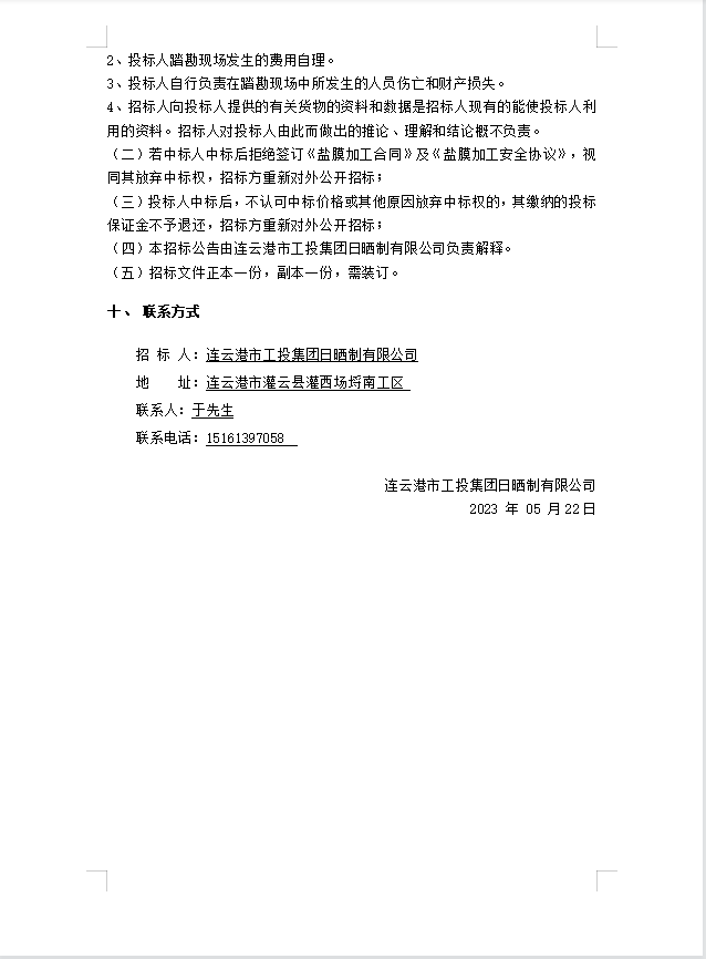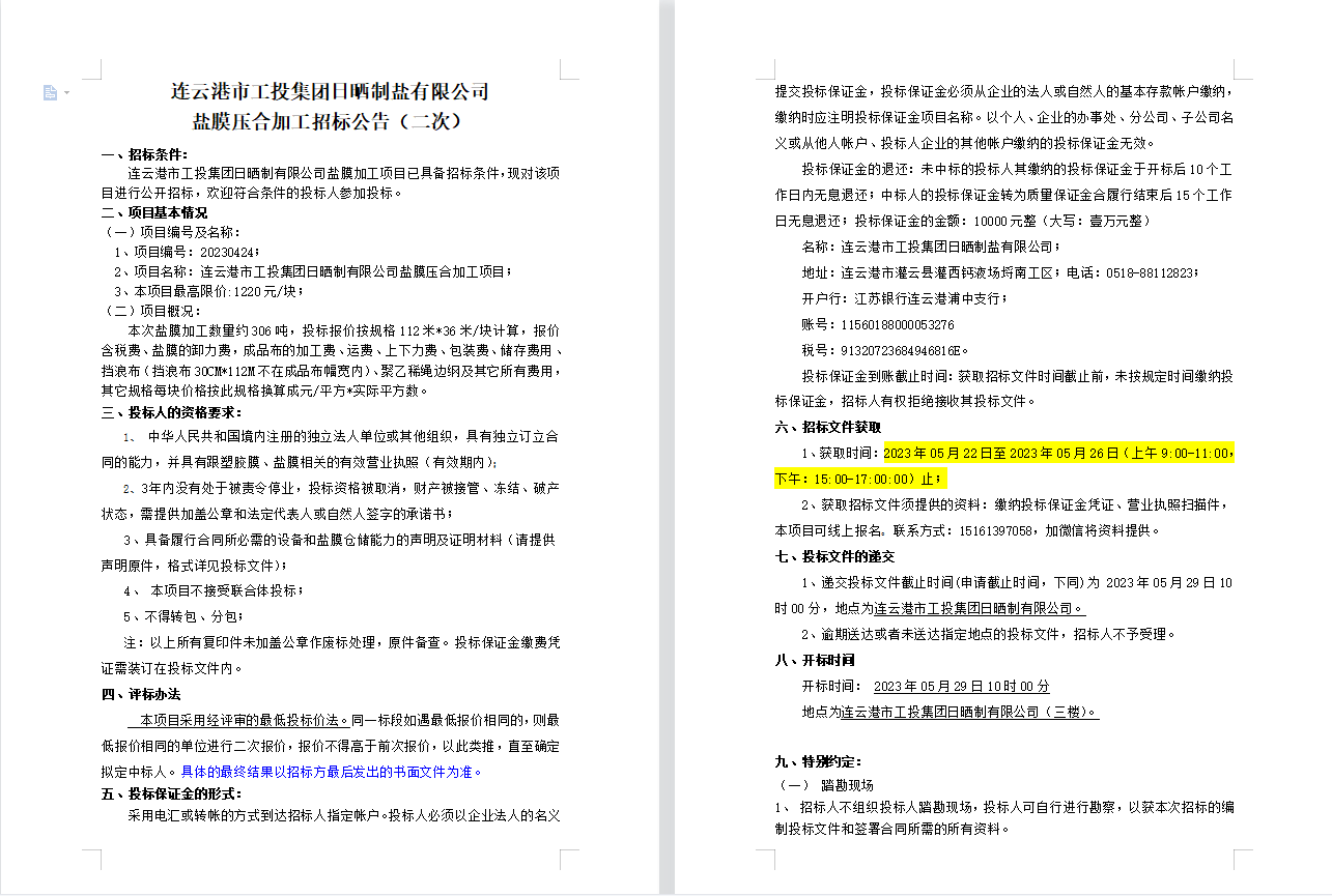 連云港市工投集團日曬制鹽有限公司鹽膜壓合加工招標(biāo)公告(二次)