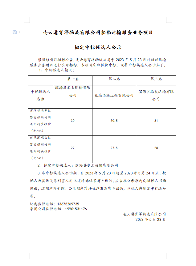 連云港宵洋物流有限公司船舶運輸服務(wù)業(yè)務(wù)項目擬定中標(biāo)候選人公示