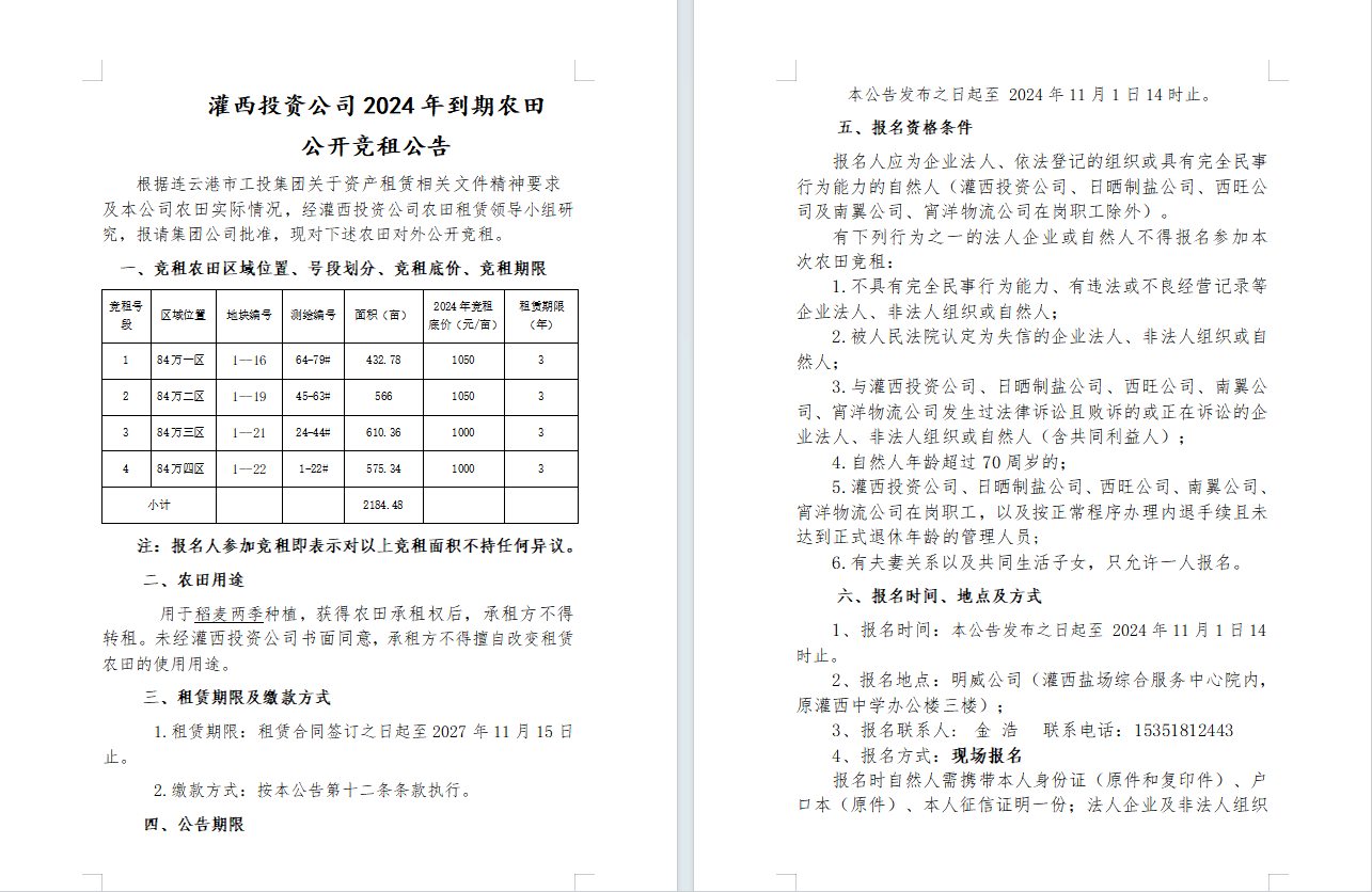 灌西投資公司2024年到期農(nóng)田公開(kāi)競(jìng)租公告
