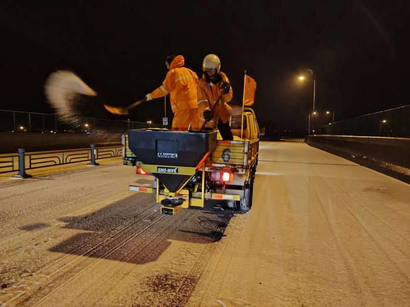 受寒潮影響,2月20日下午,港城普降“冰雪+冰粒”,投資公司第一時間啟動惡劣天氣應急處置預案,道路保潔、市政養(yǎng)護、后勤保障等戰(zhàn)線的干部職工以雪為令,在重點區(qū)域、重點路段、坡道、橋梁、涵洞等結冰路段進行撒鹽融雪融冰作業(yè),全力以赴除冰雪、防事故、護平安,為市民群眾出行一路“護航”。