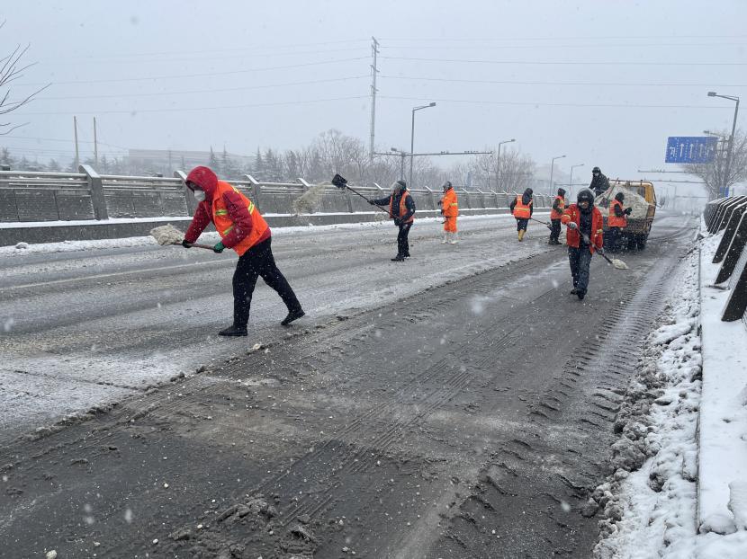 “融雪劑拋灑的時(shí)候要均勻拋灑,不要成團(tuán)堆積,這樣不僅融雪的效果不好,還會(huì)浪費(fèi)物資。”預(yù)備黨員武新忠一邊說(shuō)著,一邊示范著給其他隊(duì)員。哪里的積雪最厚,哪里就有他們揮鍬鏟雪的身影。在融雪劑不能及時(shí)送達(dá)的情況下,他們就使用人工除雪的方式,不斷檔、不離線、不缺位的清除路面積雪,保證路面不出現(xiàn)積雪狀況。為堅(jiān)決完成上級(jí)“雪停路凈”的掃雪除冰任務(wù),他們不畏嚴(yán)寒,冒著風(fēng)雨冰雪,晝夜不停,連續(xù)三天奮戰(zhàn)在掃雪的一線!以雪為令,雪不停,掃雪不止,一直堅(jiān)守在掃雪工作中,有效清除了區(qū)域內(nèi)的積雪,確保了交通道路的安全暢行。