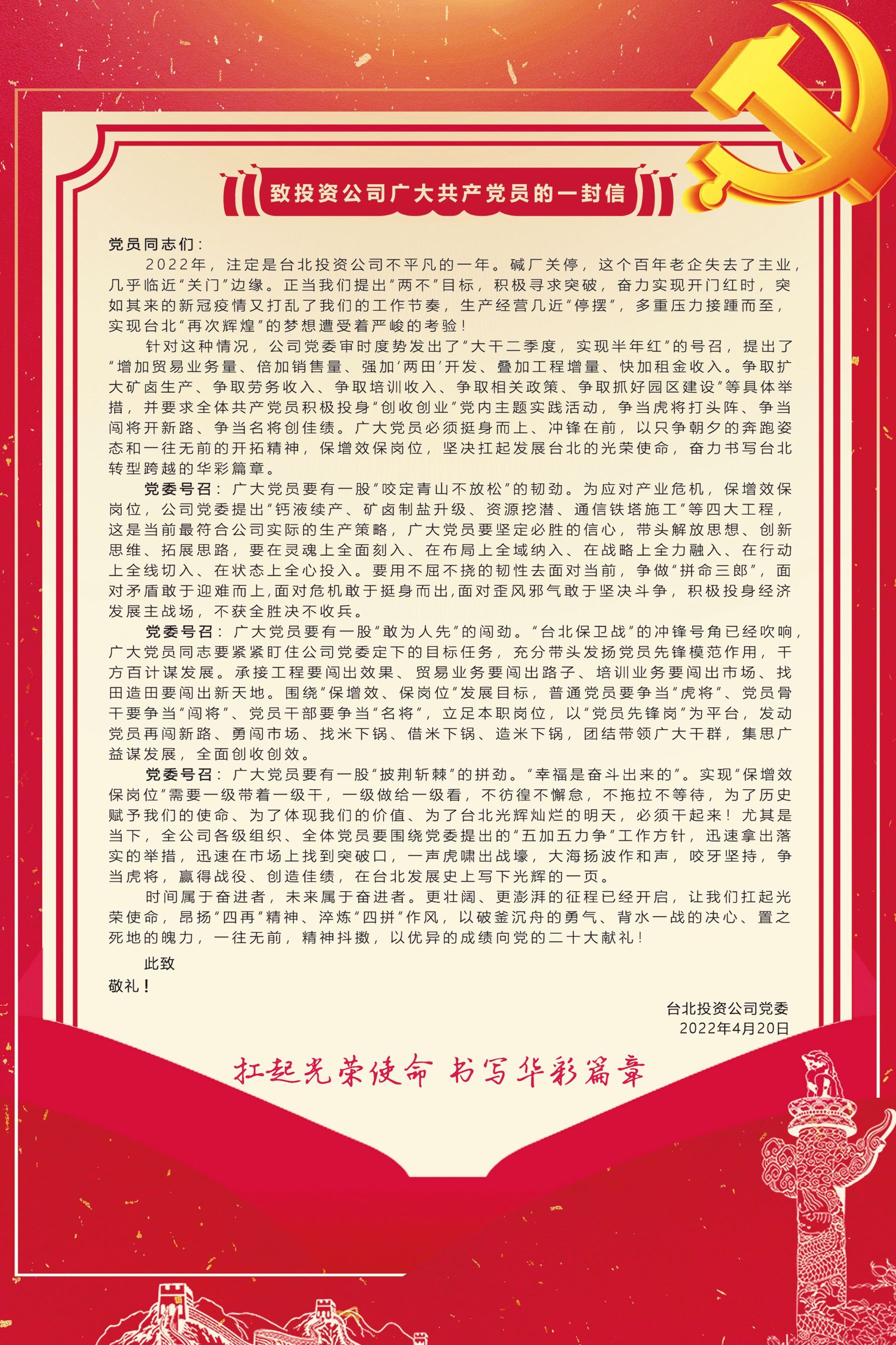 扛起光榮使命 書寫華彩篇章——致投資公司廣大共產(chǎn)黨員的一封信