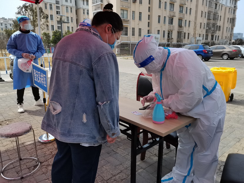 清晨6點30分,1號檢測點,李明同志在檢查物資,“大白”服裝4套、“小藍”服裝6套、棉簽600根……;2號檢測點,于洪亮在將物資上桌,病毒核酸檢測試管、棉簽、消毒液,“還缺少一瓶酒精,我立即反饋給社區(qū),請社區(qū)抓緊安排送來”;4號檢測點,蘇玲、秦黎明正在互相幫忙穿好防護服,“秦姐,這個防護面罩里外有兩層薄膜,我給你撕掉,這樣就不會有霧氣了”,“嗯嗯,你這個拉鏈得拉到頂,我們自己也一定要做好防護”秦黎明溫柔的說;5號檢測點,內(nèi)退黨員孫芳和姜海洋,互相在防護服后背寫上對方的名字,以便于更高效的完成檢測工作;6號檢測點,霍正鋼、朱文健、韓永剛、邱榮濱正在清點檢測小卡片;7號檢測點,張強在拿著酒精給廢物處置垃圾箱消毒;8號檢測點,新加入的孫銀、占恒春、尹永明、韓永光、趙紹慶正在給消殺噴霧劑灌裝84消毒液,社區(qū)8個檢測點的消殺工作全部由昌圩臨時黨支部志愿者負責。