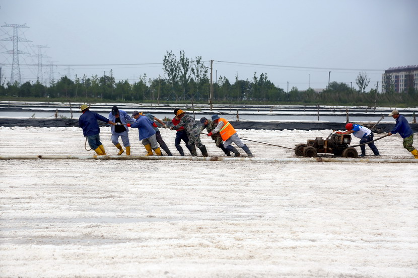 今年以來,針對政府征地、堿廠關(guān)停的現(xiàn)實,投資公司積極推進生產(chǎn)方式變革,打破一年兩季固有收鹽模式,實現(xiàn)原鹽隨用隨收。在海州灣先鋒東灘扒鹽一線,王德志仔細(xì)觀看了作業(yè)情況,現(xiàn)場收鹽職工正在進行挪機工作。