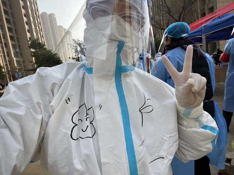 ? 3月12日,晴,8:00到達(dá)社區(qū)核酸采樣點(diǎn),準(zhǔn)備上崗,社區(qū)負(fù)責(zé)人給我們進(jìn)行了“防護(hù)服穿脫”及防疫知識的講解學(xué)習(xí)等一系列十分細(xì)致地培訓(xùn)后,有點(diǎn)興奮的穿好“大白服”,帶上手套、頭套和面罩,社區(qū)阿姨還幫我在衣服上畫上了可愛的涂鴉;
