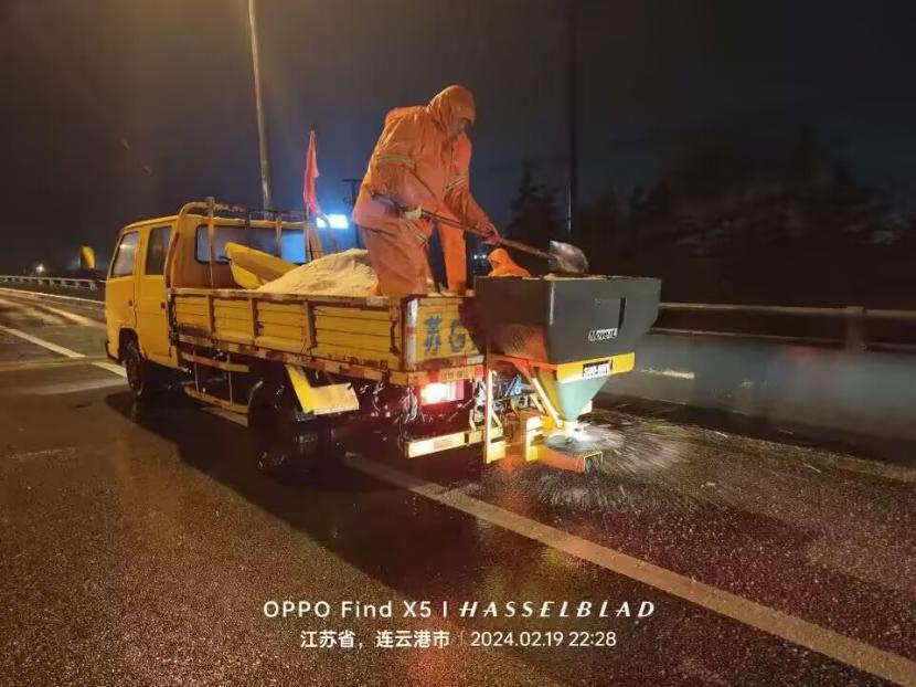 夜晚12點,在佟圩路馬山立交,孫玉虎在工程車上一邊拋撒融雪劑一邊指揮:“融雪劑一定要撒布均勻,適當擴大距離,避免浪費。”工程班金華、蘇志國、林軍、李林不停地在風雪中揮舞著鐵锨,絲毫顧不上被風雪擊打的面部疼痛。