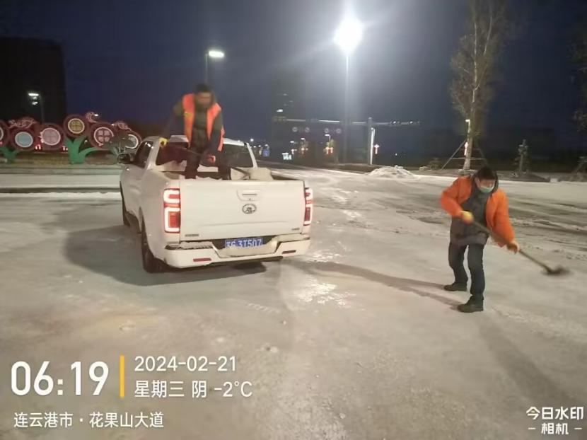 夜晚10點,在黃海大道,支部書記范曉寶親自帶隊,帶領張巖、盛小雷、薛加兵等6名黨員,冒雪奮戰(zhàn)、連續(xù)作業(yè),拋撒融雪劑,進行緊急除雪除冰作業(yè)。